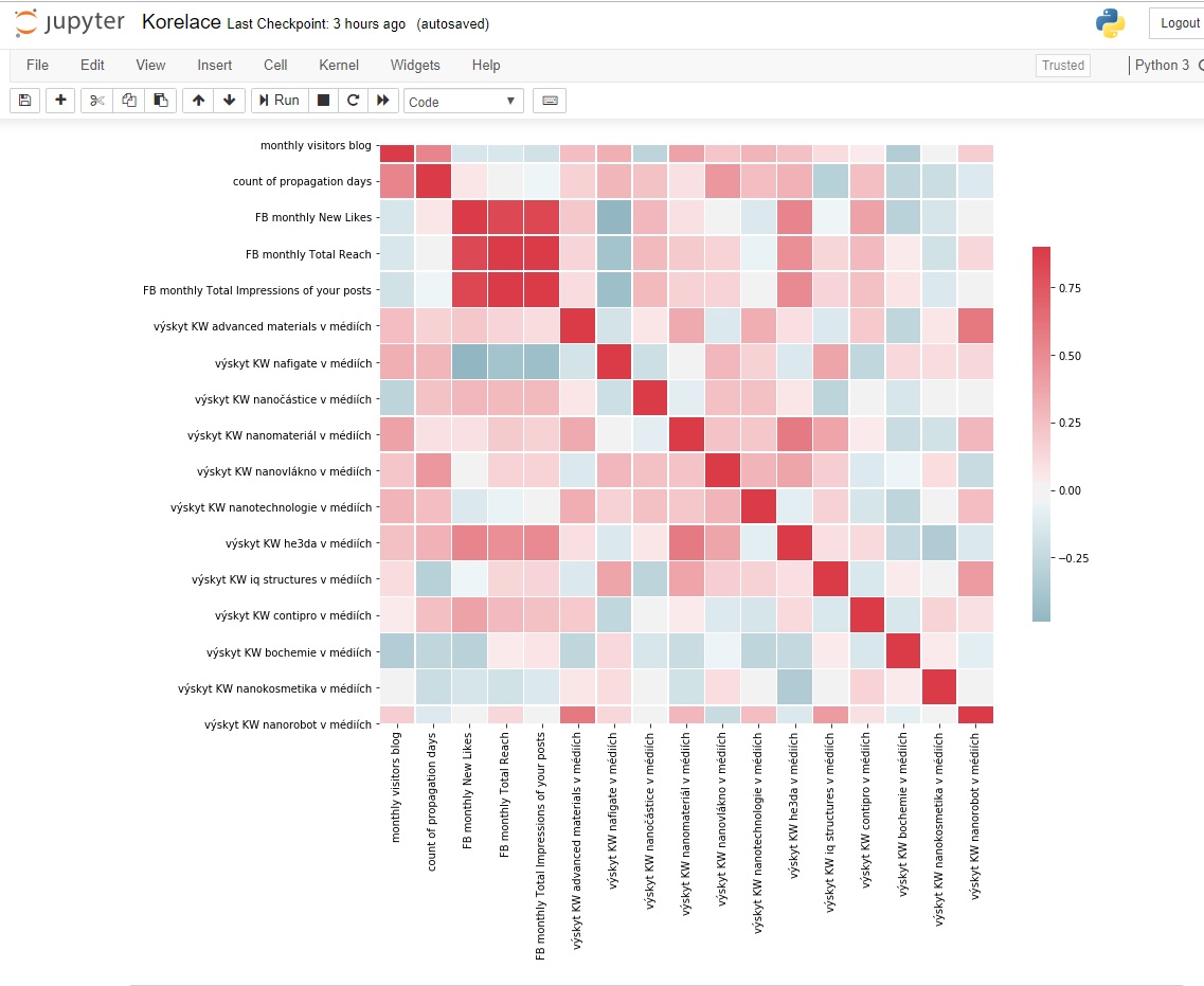 Kromě očekávaných korelací, které nepotřebují příliš analyzovat, bychom vypíchly středně silnou korelaci (0,32) mezi návštěvností webu (zde jako daily visitors blog) a návštěvností facebookové stránky (zde jako FB Daily Total Reach a FB Daily Total Impressions of your posts). V obou případech (jak u dosahu FB, tak u FB impresí) jde o hodnotu 0,32 při korelaci s návštěvností webu. Jinými slovy, pokud se lidé dostanou na web, také se dostanou i na FB stránku Česko je nano, i když sledujeme pouze středně silnou souvislost.